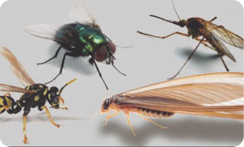 Moscas, mosquitos, avispas, abejas, polillas, etc. En la industria alimentaria una de las especies mas molestos, ademas, algunas de ellas pueden contaminar los alimentos y otras pueden picar.